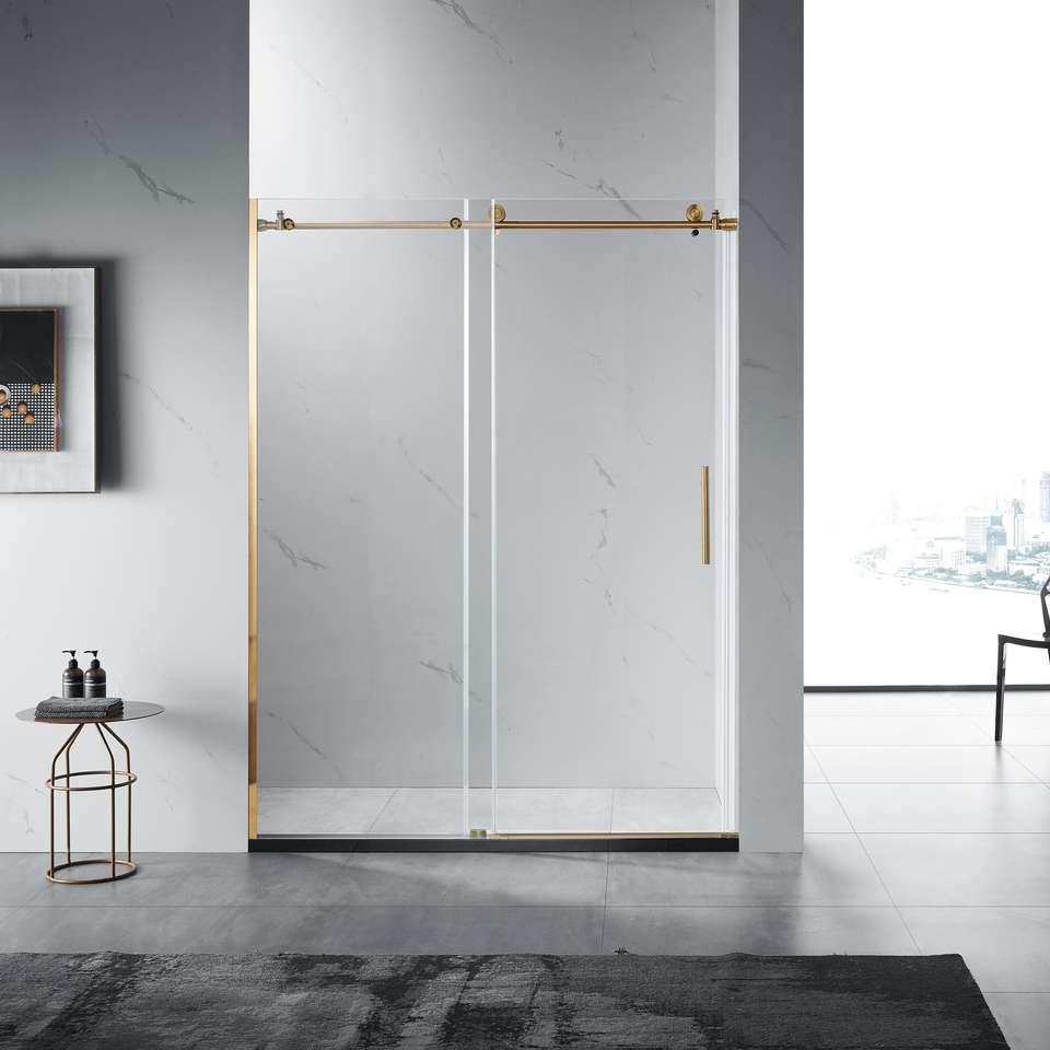 SHOWER DOOR FRAME LESS BRUSHED GOLD FINISH ONE SIDE SLIDING DOOR AVAILABLE IN SIZES 60X72' , 60X60' , 48X72' .